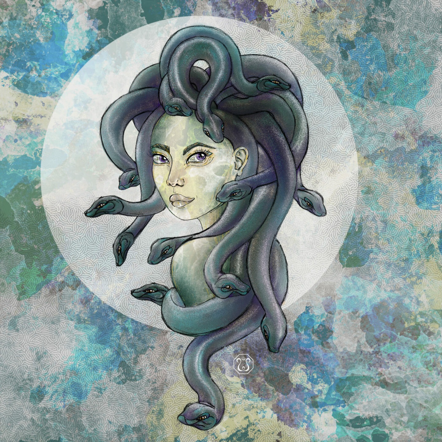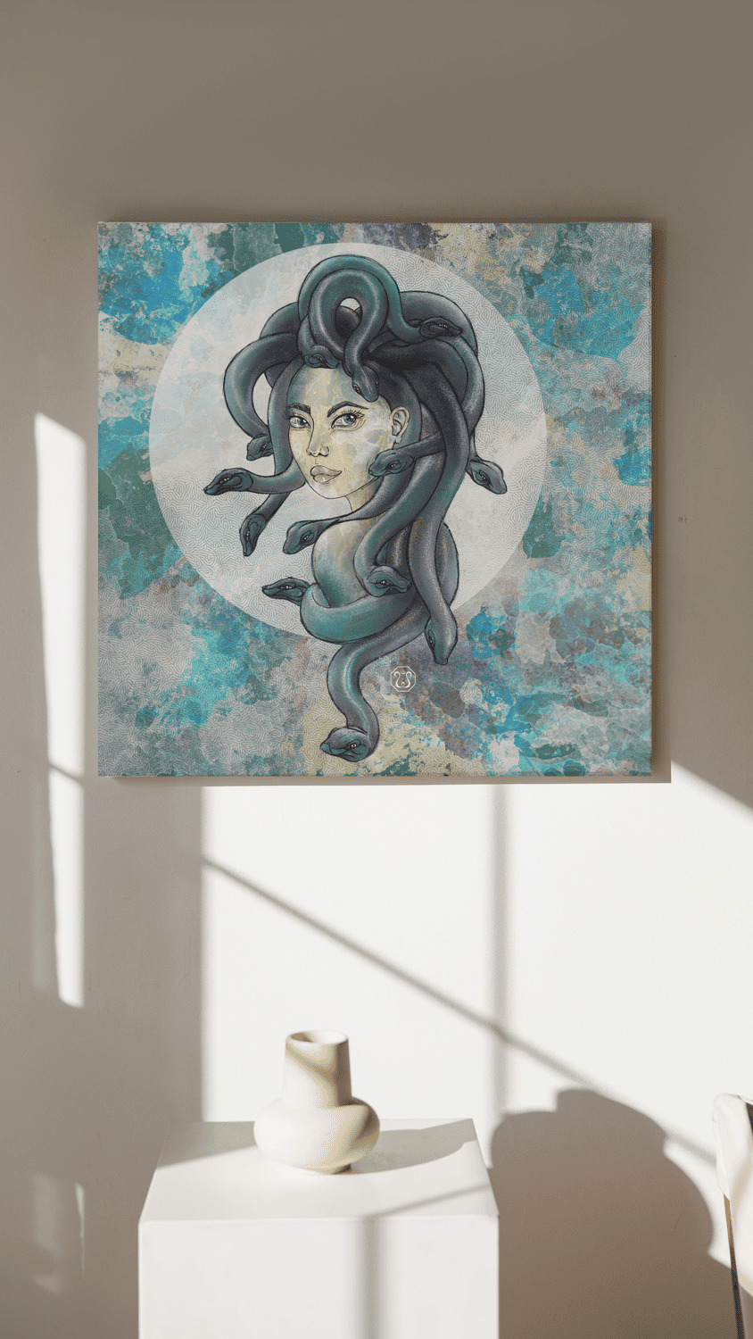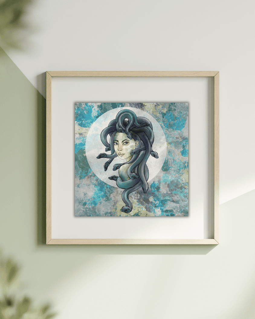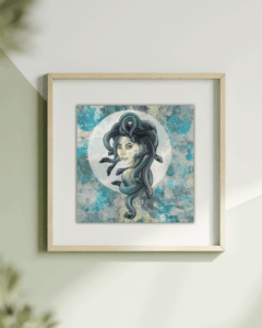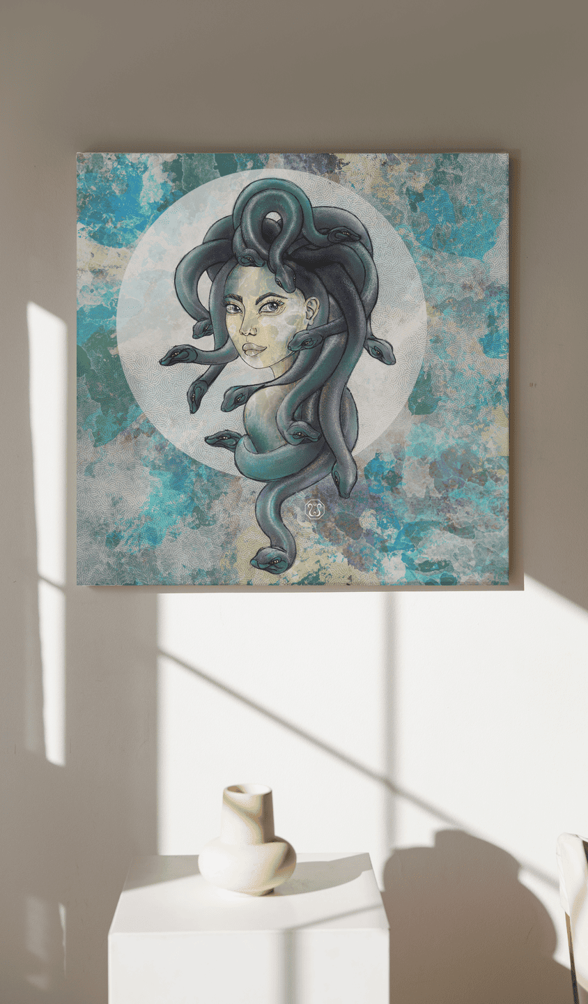 Cette figure mythologique épique est l’une de mes préférées ! Médusa, également appelée Gorgo, est un puissant symbole féminin. Elle a le pouvoir de transformer les hommes en pierre. Ses cheveux de serpents et sa peau reptilienne symbolisent le cycle naturel de la naissance, de la mort et de la renaissance.
