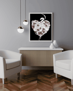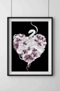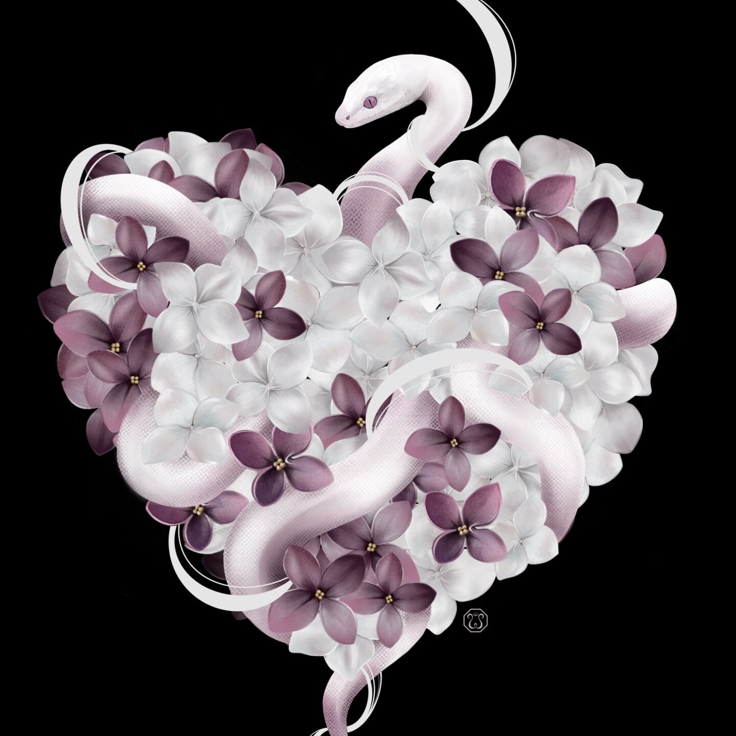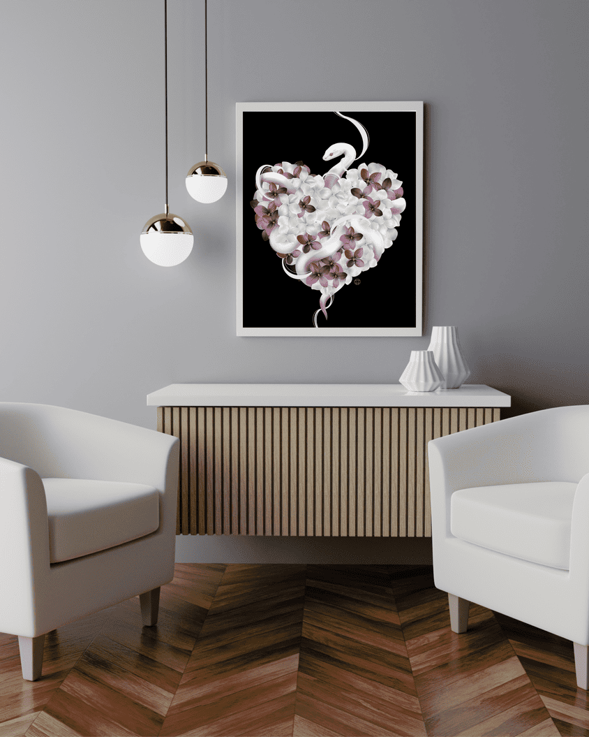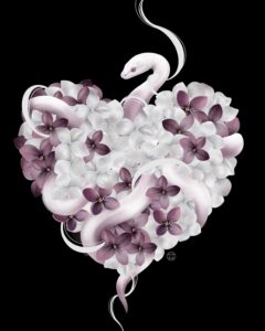 J’ai imaginé ce serpent, qui enlace un cœur fleurissant, unissant ainsi sa puissance primitive à la délicatesse des pétales. Une alliance entre force et vulnérabilité, où la nature se révèle à la fois redoutable et douce. La pureté du blanc et du rose amène harmonie, amour et compassion.